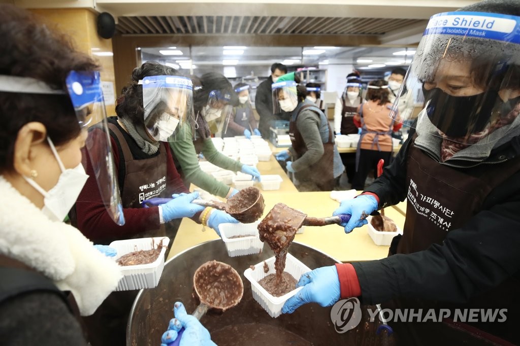 Volunteers package complimentary red bean porridge, called "patjuk," at Jogye Temple in Seoul on Dec. 21, 2020, the day of "Dongji," or the winter solstice, to give them to visitors as takeout amid the coronavirus pandemic. Korean people customarily eat patjuk on Dongji to follow the ancient belief that the red color of the beans provides positive energy to drive away evil spirits. (Yonhap)