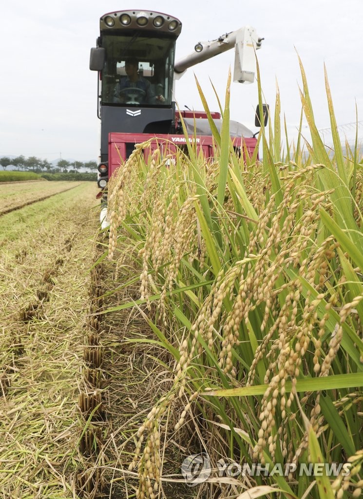 Farmer Kim Kyung-yang uses a machine to harvest rice on a paddy in the southeastern port city of Busan on Aug. 23, 2021, after planting an early ripening variety of rice seedlings on April 19. It marked this year's first rice harvesting in the region. (Yonhap)
