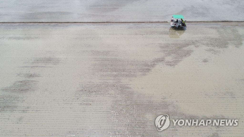 Farmers use a machine to plant an early ripening variety of rice seedlings at a paddy in Hamyang, South Gyeongsang Province, southeastern South Korea, on April 20, 2020, in this photo released by the Hamyang municipal office. (PHOTO NOT FOR SALE) (Yonhap)