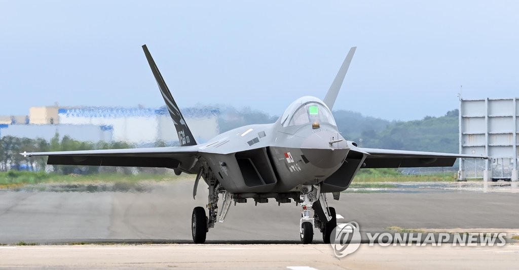 A prototype of the homegrown KF-21 fighter under development struts across a taxiway during a media demonstration at the headquarters of Korea Aerospace Industries Ltd., the country's sole aircraft maker, in Sacheon, 437 kilometers south of Seoul, on July 6, 2022, as South Korea is looking to conduct its maiden flight late this month. (Pool photo) (Yonhap)