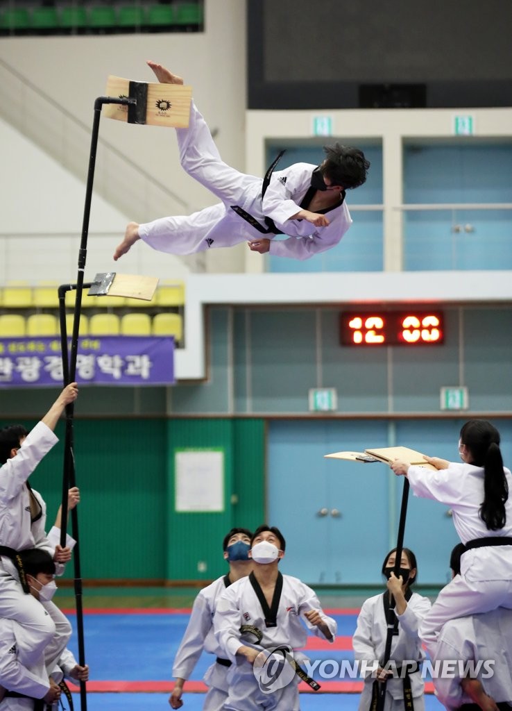 The demonstration team of the World Taekwondo Headquarters practices at Dongshin University in Naju, 355 kilometers south of Seoul, on Jan. 10, 2022. The team promotes the Korean martial arts at the opening and closing ceremonies of the Olympics and other international championships. (Yonhap)
