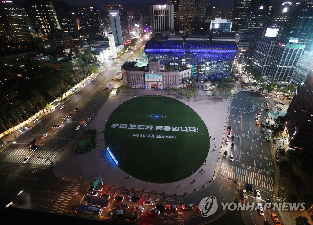 Seoul metropolitan government's "We're All Heroes!" catchphrase is illuminated in blue at Seoul Square in front of Seoul City Hall on April 24, 2020. The catchphrase and the Blue Light Campaign are part of a program to thank all citizens and medical personnel who have contributed in the fight against COVID-19. (Yonhap)