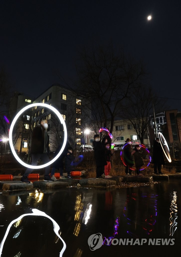 People whirl cans with LED lamps along a stream in Seoul on Feb. 13, 2022, as they take part in "jwibulnori," a traditional game, two days ahead of the first full moon of the lunar new year. The game, in which people used to swing around burners full of coals in rice paddies, is designed mainly to chase away evil spirits and bad luck. (Yonhap)