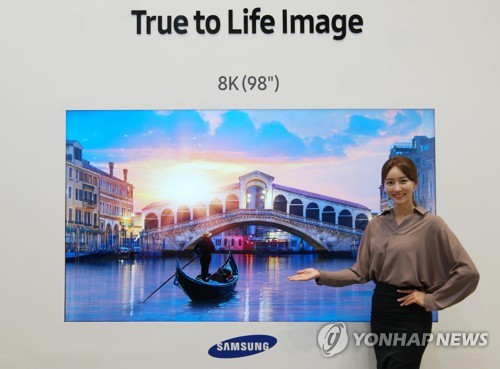 A model shows off Samsung Electronics Co.'s 98-inch ultra high definition LCD at the 2017 International Meeting on Information Display at an exhibition center in Seoul on Oct. 17, 2017. The tech giant provided this photo. (Yonhap) (END)