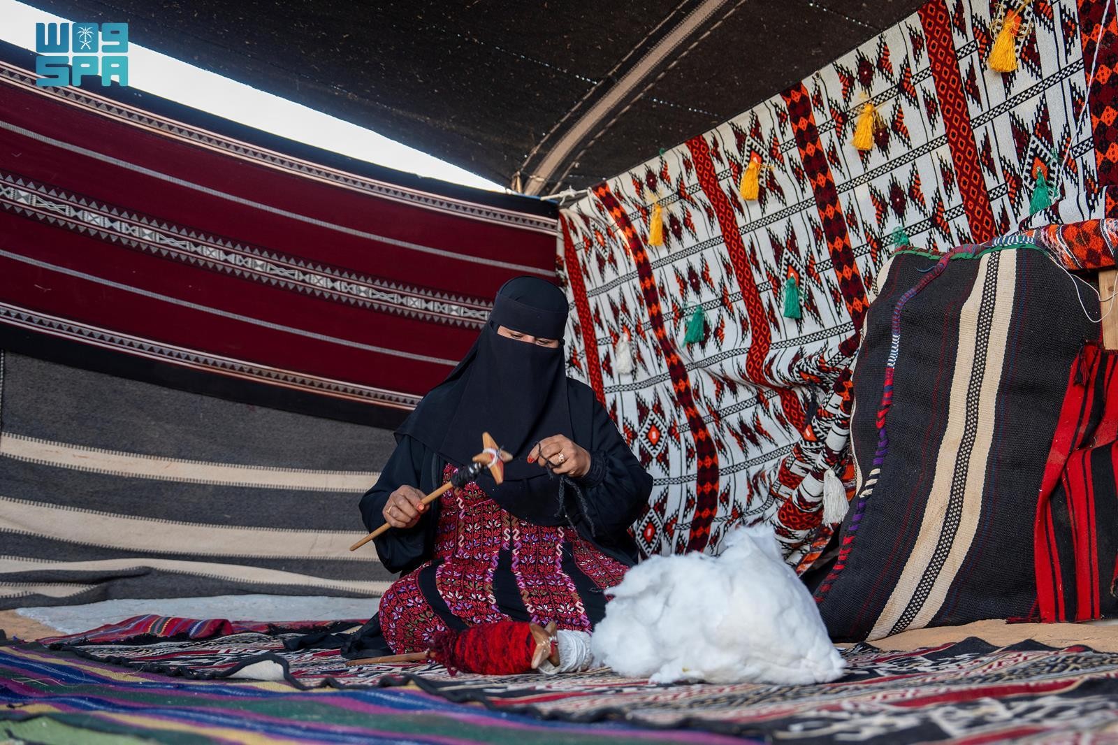 Al-Jouf craftswoman Lufwa Al-Fuhaiqi inherited the art of tent-making from her mother and grandmother and continues the tradition today using goat hair and Najdi sheep wool. The detailed process begins with shearing the wool, followed by washing, drying, and spinning it into strands that are then woven into large pieces to form the tent. According to Lufwa, tent-making is a collaborative effort where more hands help speed up the work.
