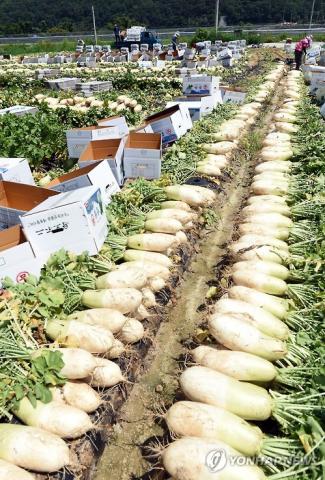 Farmers harvest Korean radishes from a field in the city of Chuncheon, northeast of Seoul, on July 19, 2016. (Yonhap) (END)
