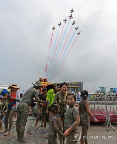 Tourists enjoy a mud festival at Daecheon Beach in Boryeong City, South Chungcheong Province, on July 20, 2014, as the South Korean Air Force's aerobatic team, the Black Eagles, performs an acrobat