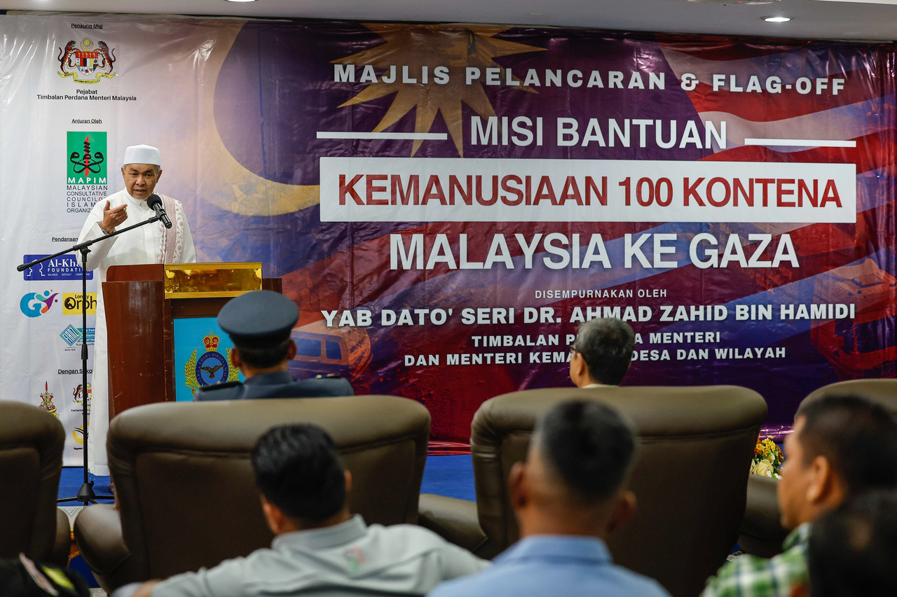 Deputy Prime Minister Dr Ahmad Zahid Hamidi officiated at the flagging-off of the Malaysian 100-Container Emergency Humanitarian Aid Mission from Cairo to Gaza led by the Consultative Council of Malaysian Islamic Organisations (MAPIM) at the Royal Malaysian Air Force base in Subang near here.