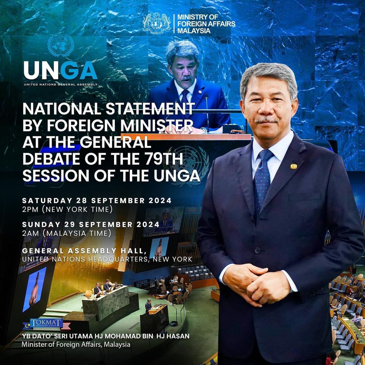 NEW YORK, Sept 28 (Bernama) -- Malaysia’s Foreign Minister Mohamad Hasan is set to deliver the country’s national statement on Saturday (Sunday in Malaysia) at the High-Level General Debate of the 79th United Nations General Assembly (UNGA) here.