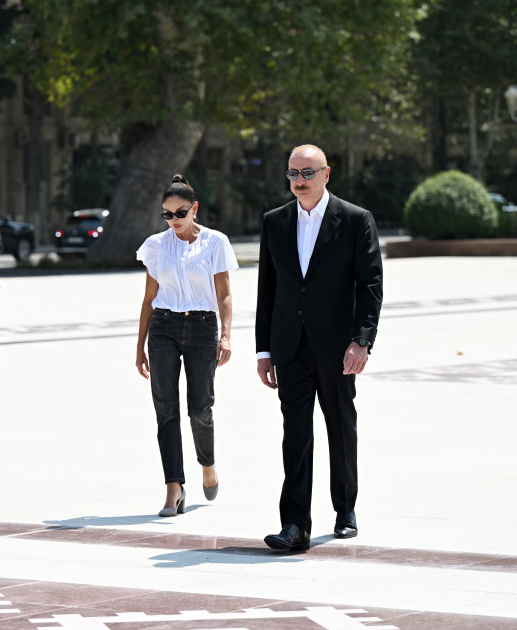 The head of state and the First Lady visited the monument of National Leader Heydar Aliyev in the city center, placing bouquets of flowers in front of it.