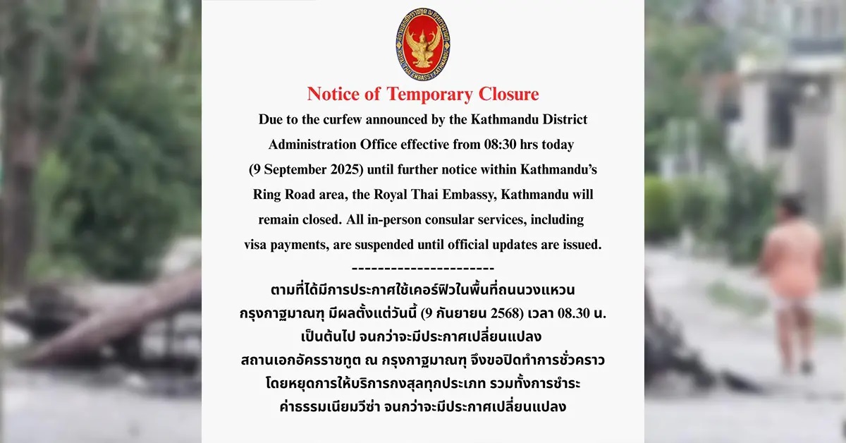 The embassy advises Thai citizens with travel plans to contact their airlines to reconfirm flight schedules and necessary documents. For emergencies, Thais can contact the embassy at +977 9818749944. -819 (TNA)
