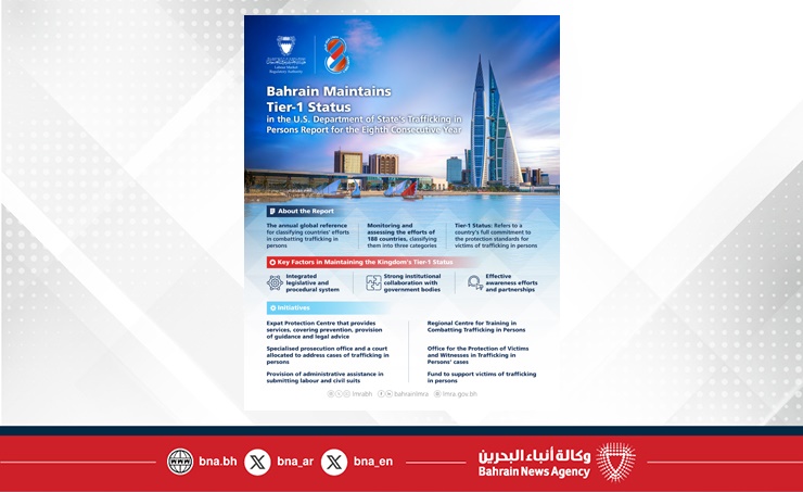 Manama, Sep. 30 (BNA): The Kingdom of Bahrain has achieved another milestone in safeguarding human rights by maintaining its Tier-1 ranking in the U.S. Department of State’s Trafficking in Persons (TIP) Report for the eighth consecutive year. This recognition reflects the Kingdom’s distinguished international standing and underscores the success of its comprehensive national efforts to combat trafficking in persons.