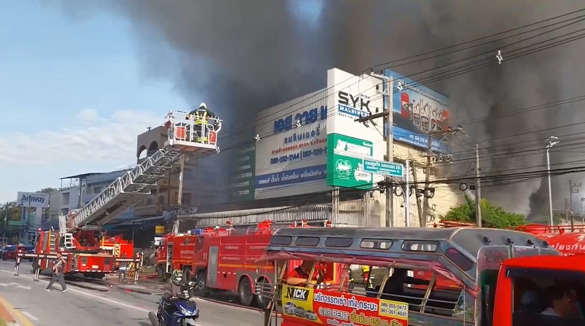 RAYONG, Oct 3 (TNA) - A major fire tore through a machinery and construction tools store in central Rayong early Friday, with emergency services struggling for hours to control the blaze as it spread dangerously close to an adjacent petrol station.