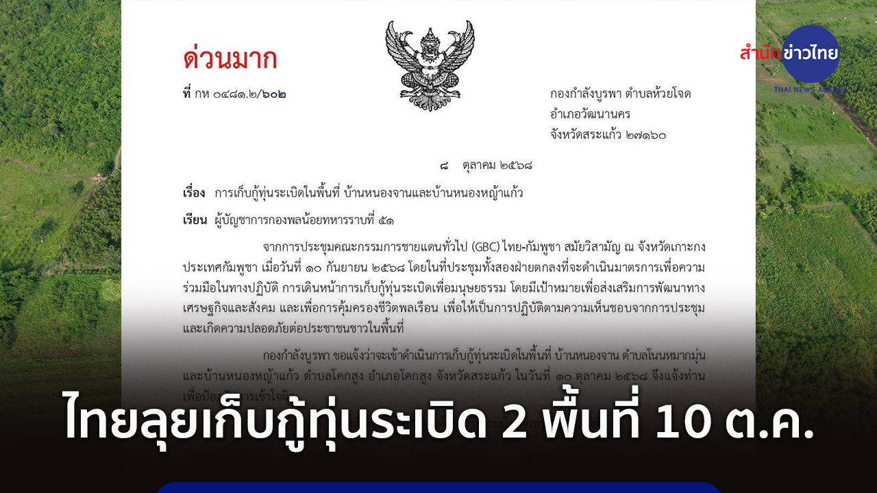 SA KAEO, Oct 9 (TNA) - Thailand's First Army Region has sent an "urgent" notification to Cambodia, informing Phnom Penh of its plan to conduct a demining operation at two border locations in Sa Kaeo province on October 10.