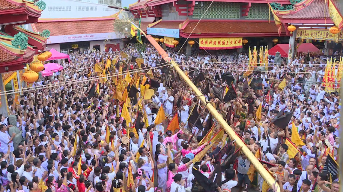 Thousands gathered at the Jui Tui Tao Bo Geng shrine for the ceremony. The pole-raising, which includes hoisting nine lanterns, signals the formal start of nine days of strict purification and abstinence from meat.