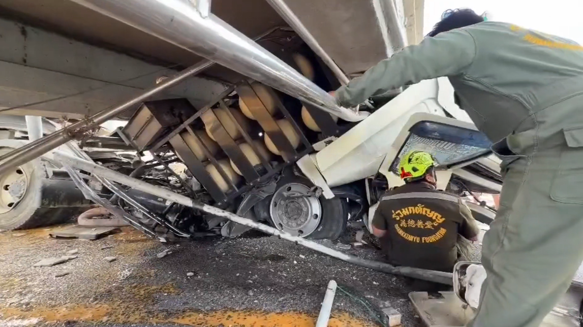 The accident occurred around 9:00 a.m. on the inbound lanes of the Bangna-Trad Road in Samut Prakan province, when a massive concrete beam fell and crushed both the involved truck and a pickup truck carrying eggs.